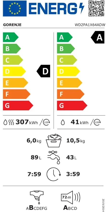 Gorenje WD2PA1X64ADW fehér, max.1400.ford, 10,5/6kg, mosó-szárítógép