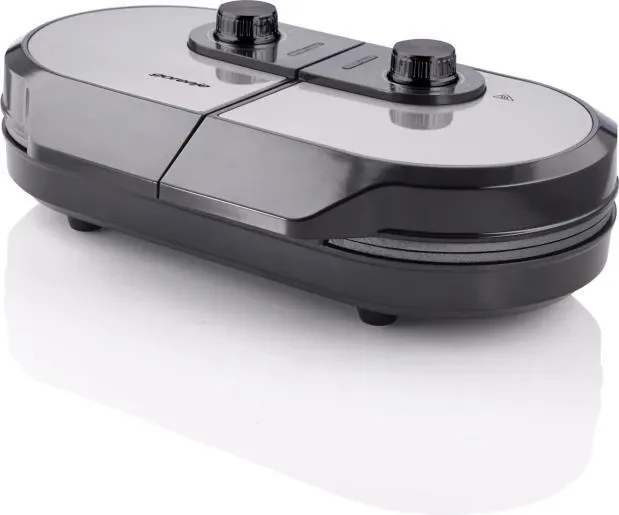 A Ø18 cm átmérőjű sütőlapok ideális méretű adagokat készítenek, ráadásul sütőlaponként külön szabályozható hőmérséklettel működnek, így egyszerre eltérő állagú gofrikat is süthet. A hideg tapintású fogantyú biztonságos kezelést garantál, így a sütés közben sem kell tartania a forró felületektől. A beépített kábeltároló gondoskodik a rendezett és helytakarékos tárolásról, míg a kompakt méret (376 × 238 × 118 mm) miatt könnyedén elfér bármelyik konyhában.