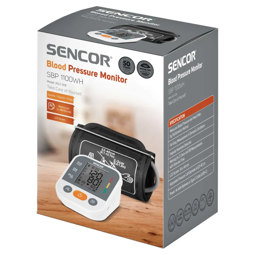 Felkaros vagy csuklós vérnyomásmérő esetén is kulcsfontosságú szerepe van. A rosszul kiválasztott mandzsetta pontatlan mérési eredményekhez vezethet. A Sencor SBP 1100WH vérnyomásmérő 22 és 42 cm közötti karméretre állítható be, továbbá automatikus felfújó és kieresztő funkcióval valamint testmozgás érzékelővel lett felszerelve. A ComfortMe technológia biztosítja a kellemes mérést, kellemetlen nyomásérzet nélkül, a mérés pontosságát az MWI technológia garantálja.