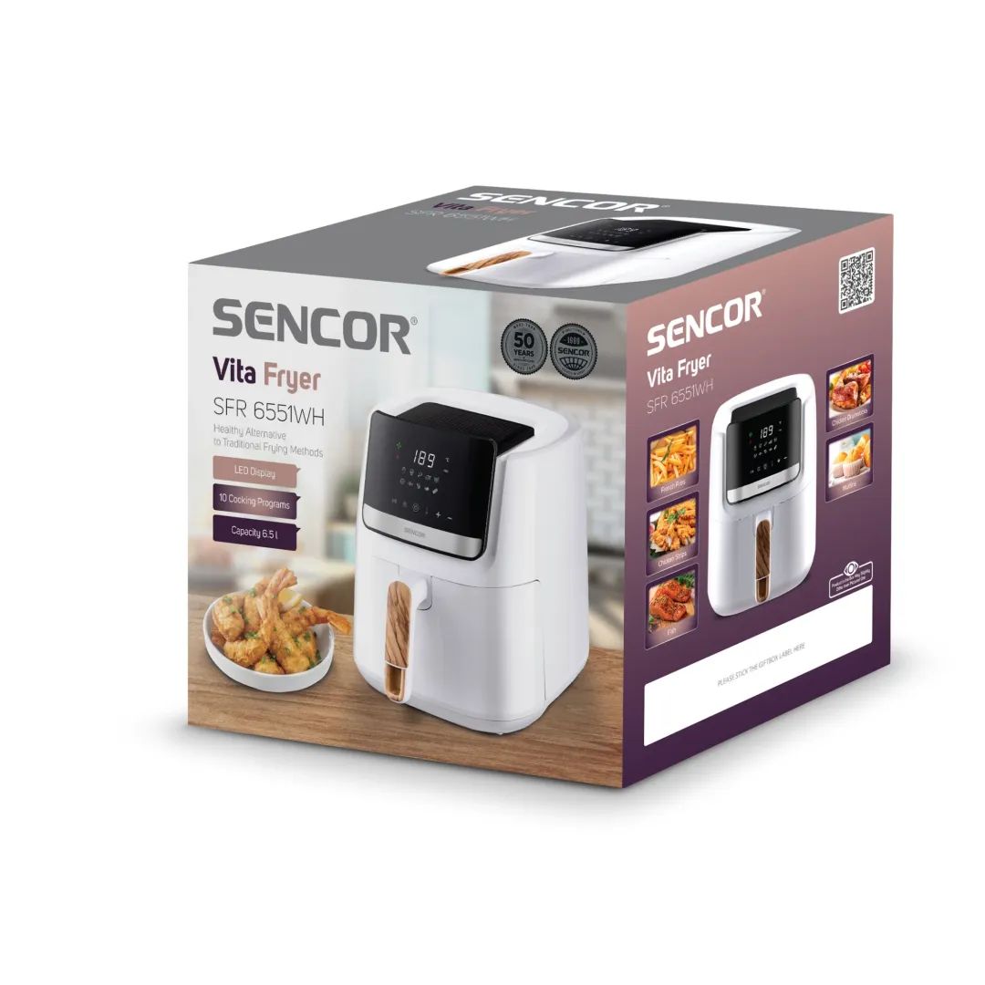 A Sencor SFR 6551WH multifunkciós forrólevegős fritőz a hagyományos olajban sütés egészséges alternatívája. A készülék 1600 W teljesítménnyel 6,5 literes kapacitású kosárral és állítható hőmérséklet szabályzóval lett felszerelve. Mindössze 3 perc szükséges a felfűtéshez és már készítheted is kedvenc fogásaidat zsiradék hozzáadása nélkül, legyen az hasábburgonya, hal vagy zöldség. A gyárilag beállított 10 program is az Te kényelmed hivatott szolgálni. A készülék egyik nagy előnye a kivehető sütőkosár, amely tapadásmentes felülettel és hideg érintésű fogantyúval lett ellátva. A Sencor forrólevegős fritőz nano kerámia szűrővel és speciális levegő keringgető rendszerrel lett ellátva, amely csökkenti a kellemetlen szagok kialakulását.