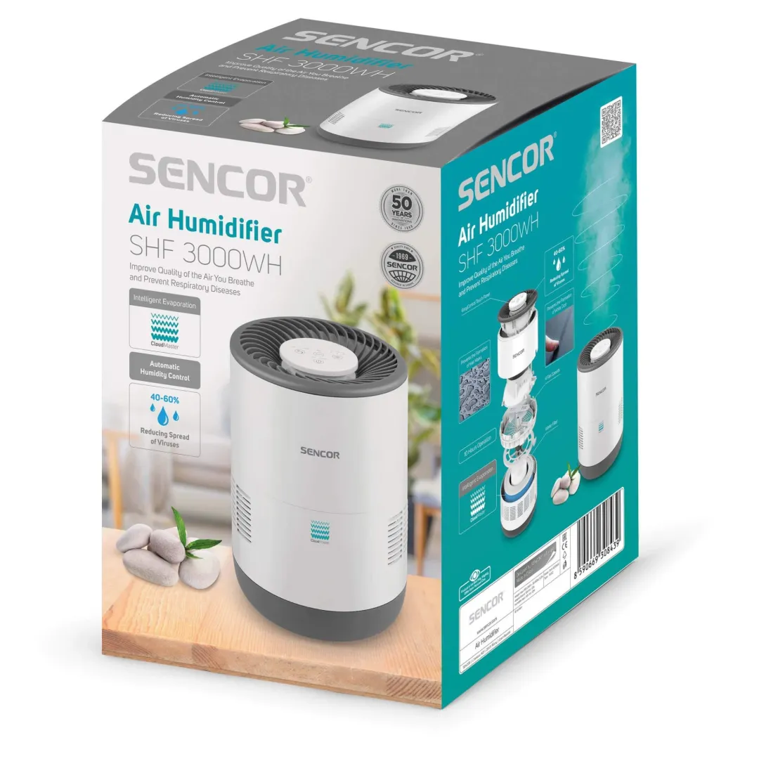 Mondj búcsút a száraz levegőnek, a Sencor SHF 3000WH párásítónak köszönhetően, ami a magas frekvenciájú ultrahangos oszcillátor elvén működik. Modern kinézetével és mindenekelőtt az intelligens páratartalom-optimalizáló rendszerrel, a megfelelő 300 ml/órás teljesítménnyel, a hosszú működési idővel és a sebességgel alkalmazkodik szinte minden helyzethez. A légzés megkönnyítése érdekében hideg párát termel, de nem befolyásolja a helyiség hőmérsékletét. Rendkívül csendes működésének köszönhetően, a hálószobákba is alkalmas. Tökéletesen használható 44 m2 alapterületig.
